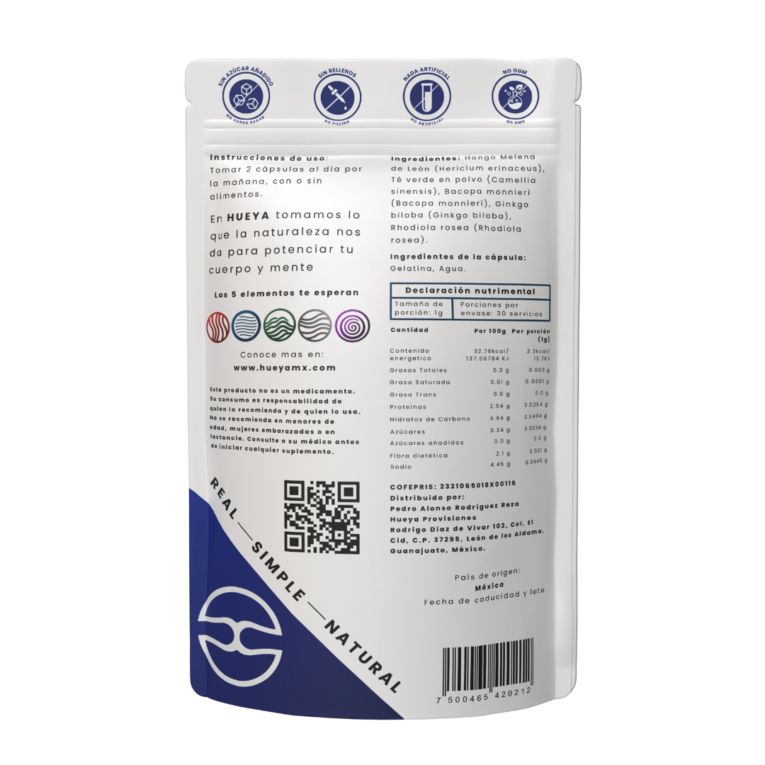 Cápsulas para enfoque mental sin estimulantes. Con Lion’s Mane, bacopa y té verde. Mejora tu claridad y memoria con 2 cápsulas al iniciar tu día.