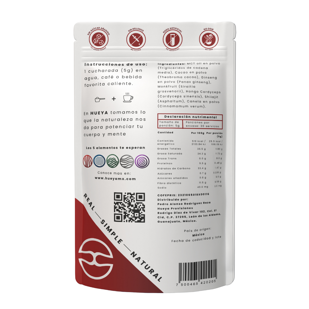 La mezcla Fuego es una fórmula natural diseñada para proporcionarte energía constante y enfoque claro. Combinando ingredientes como cafeína natural, MCT oil, cordyceps, ginseng y betabel, te ayuda a mantenerte activo y concentrado sin los altibajos de los estimulantes artificiales.